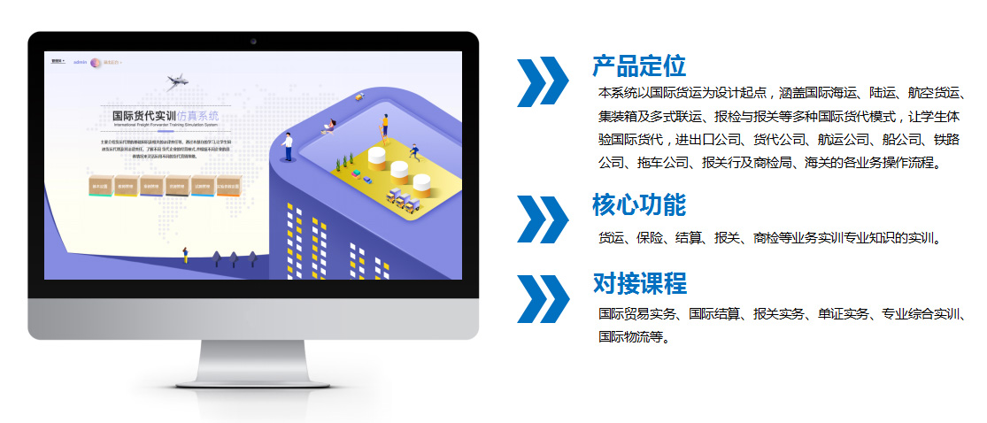 該系統(tǒng)以國(guó)際貨運(yùn)為設(shè)計(jì)起點(diǎn),模擬國(guó)際貨運(yùn)教學(xué)平臺(tái),真正讓學(xué)生理解國(guó)際貨運(yùn)企業(yè)、海關(guān)、船代、港口碼頭、堆場(chǎng)管理的真實(shí)運(yùn)做模式、崗位職責(zé)等,為學(xué)生的就業(yè)打好基礎(chǔ)。